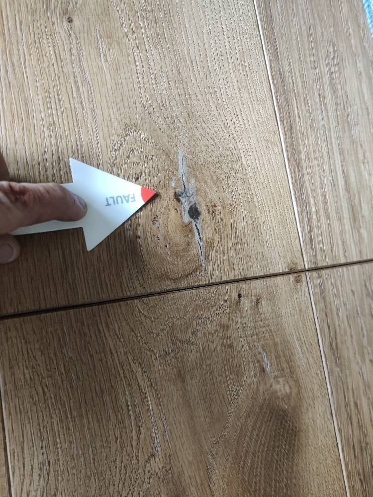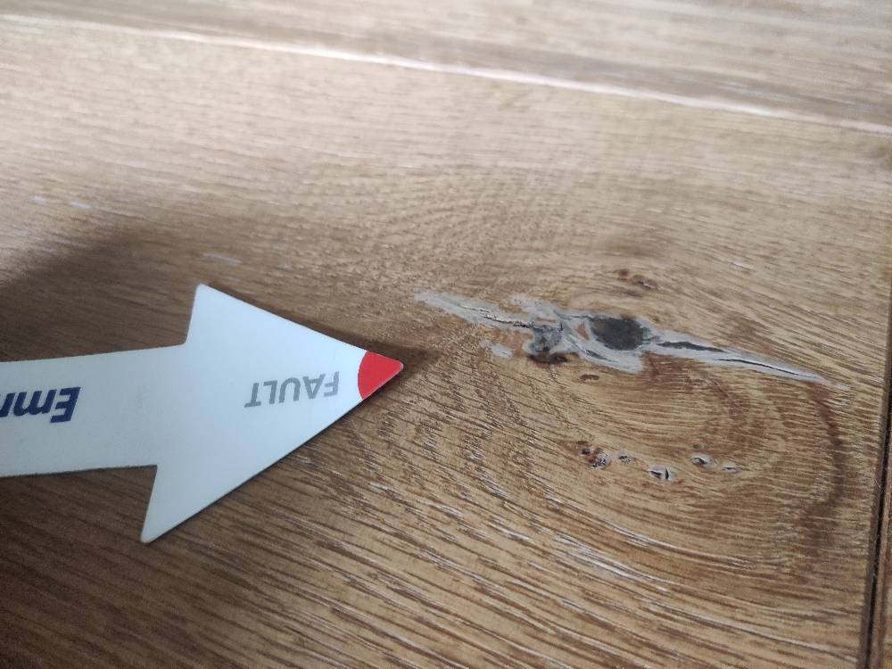 The customer noticed that the lacquered finish on their oak table had started to bubble around the natural wood knots, affecting its smooth appearance.